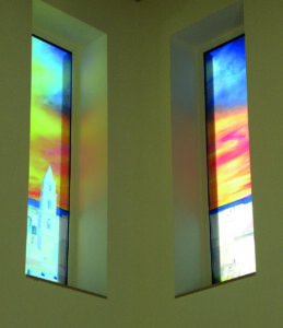 Anche la Chiesa feriale ha la forma del quadrato. Semplice nella pianta e nel volume, anch’essa ha un controsoffitto ribassato e più piccolo del quadrato del pavimento in modo che, come nell’Aula liturgica, sono messe in evidenza le estremità delle travi portanti il solaio di copertura, travi che volutamente sono dipinte color tortora per renderle evidenti visto che il controsoffitto è bianco come le pareti della Chiesa. Per le sei grandi finestre della Chiesa feriale abbiamo chiesto ancora una volta l’intervento della pittrice Beatrice Capozza e, come per le altre raffigurazioni, abbiamo preso dei riferimenti dalla Sacra Bibbia, precisamente dai Vangeli e dall’Apocalisse: volevamo da un lato riferirci alla luce e dall’altro conservare il concetto di protezione della Madonna.