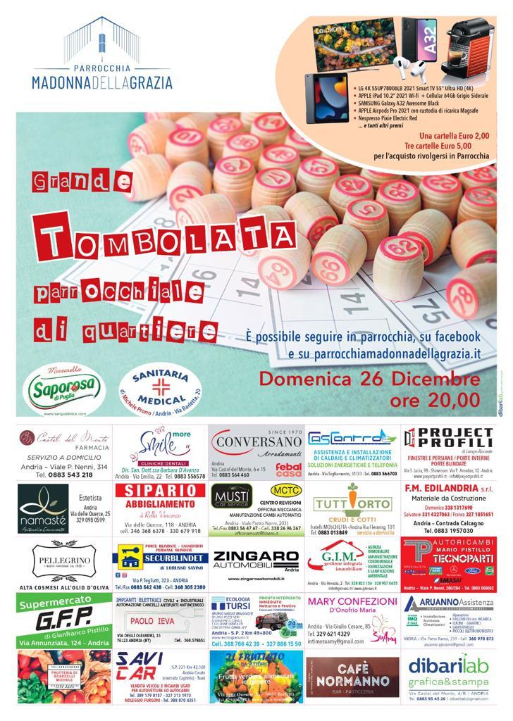 Domenica 26 dicembre 2021 a partire dalle ore 20, in occasione delle festività natalizie, si svolgerà la "Grande Tombolata parrocchiale di quartiere". Puoi acquistare le cartelle rivolgendoti in Parrocchia.